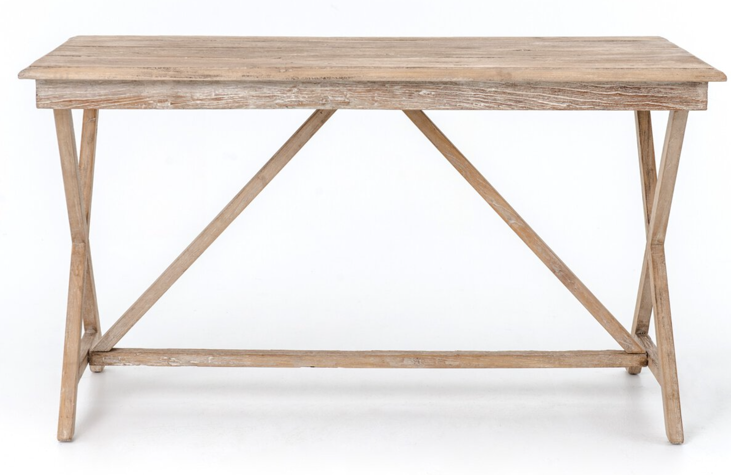 Criss-crossed and angled supports add architectural interest to a spare, French-inspired desk. A lightly whitewashed finish serves to bring out the warmth of the wood.